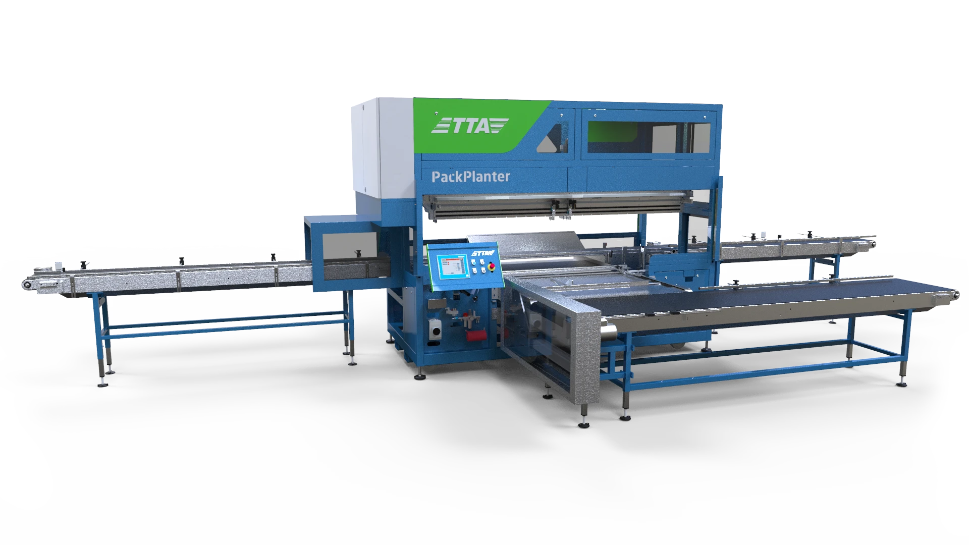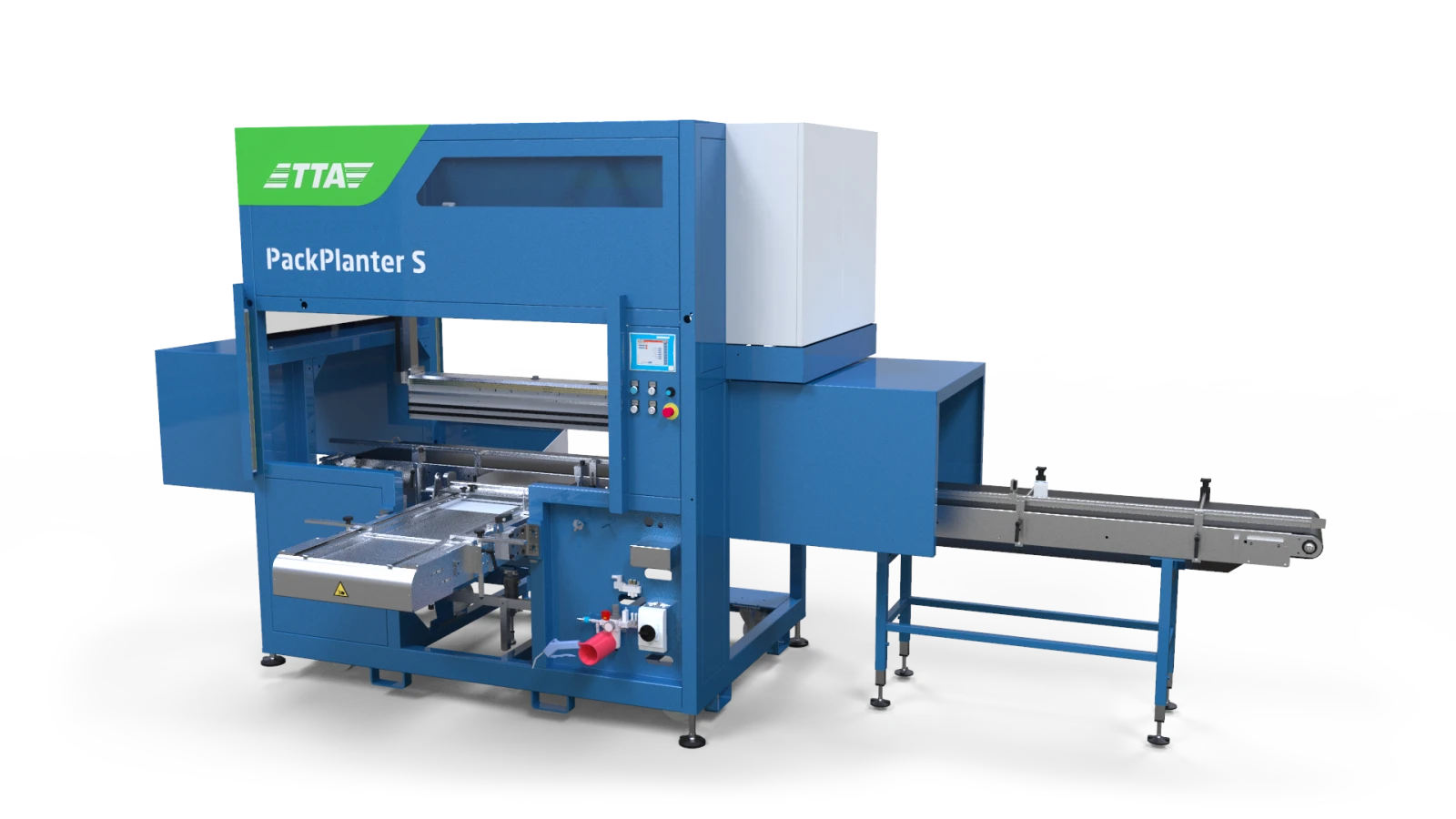 Eine vollautomatische Pflanzmaschine für Torfblöcke.