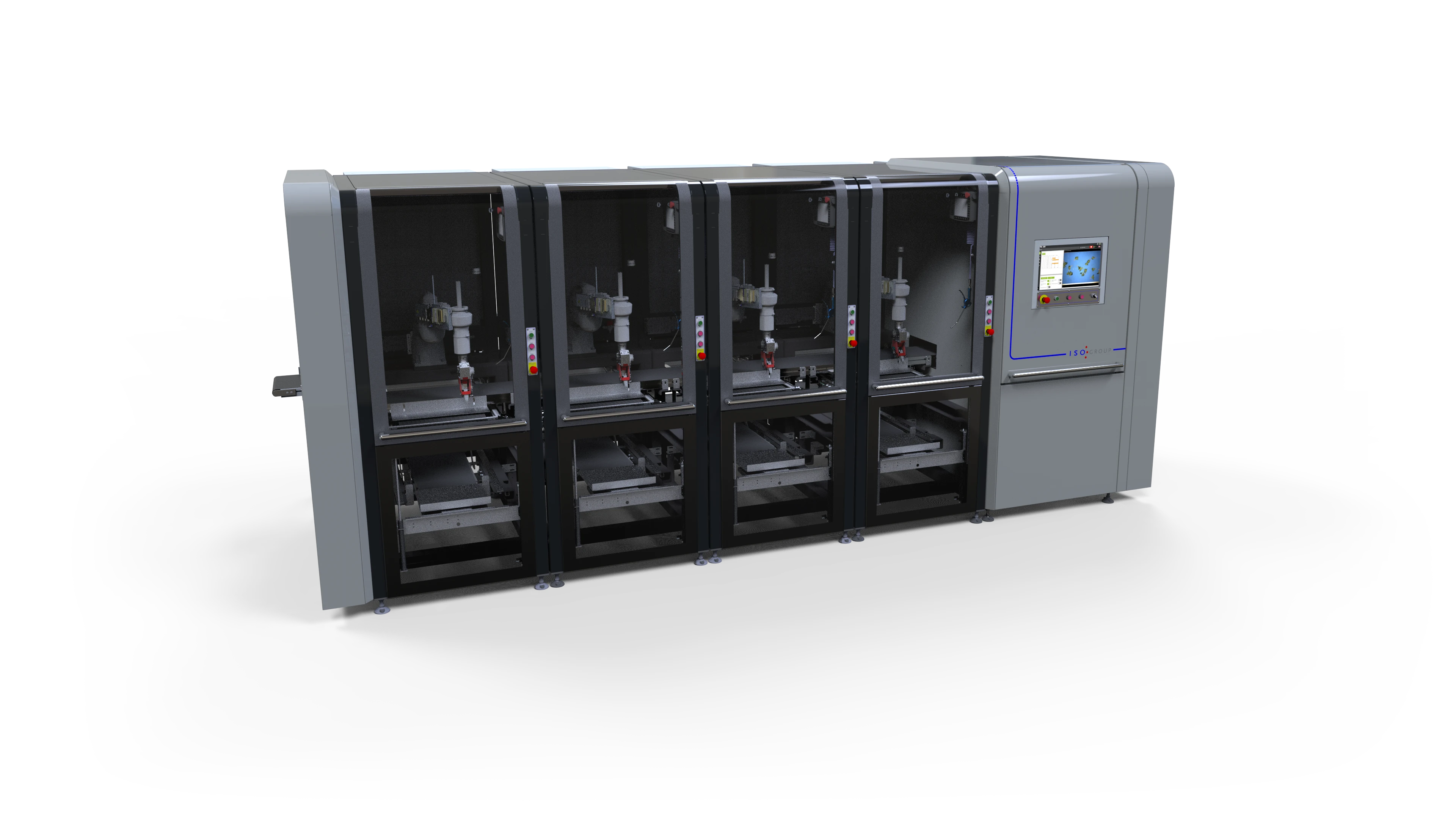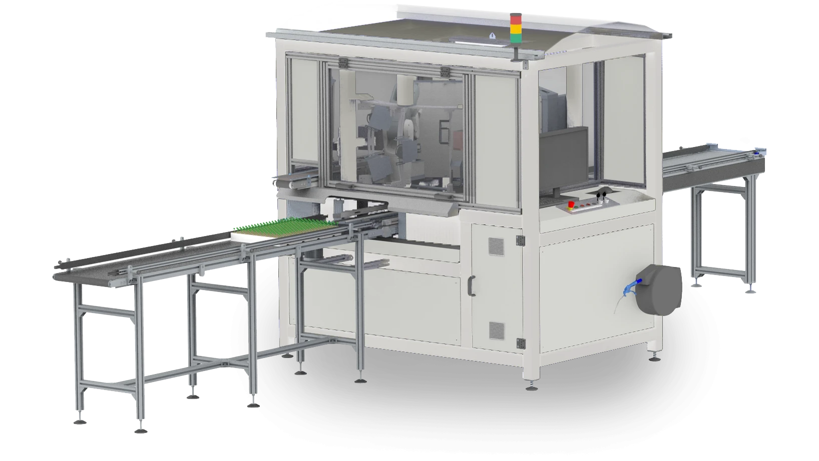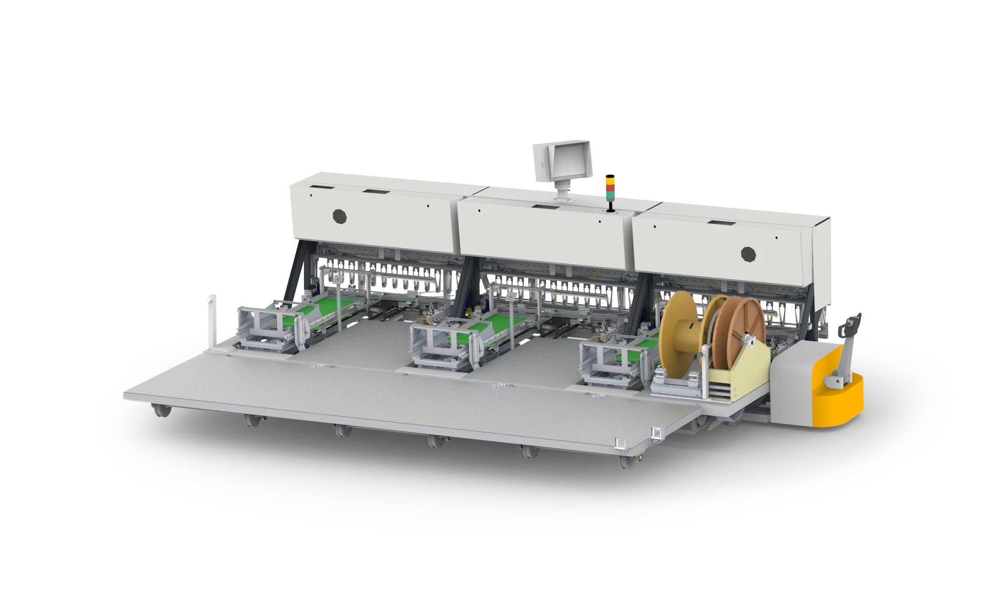 Ein doppeltes Fördersystem mit Anschlagpositionen für einzelne trays und entsprechenden Arbeitspositionen.