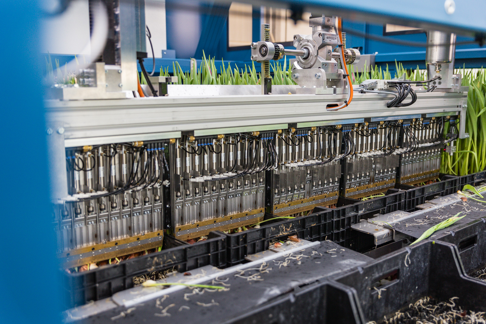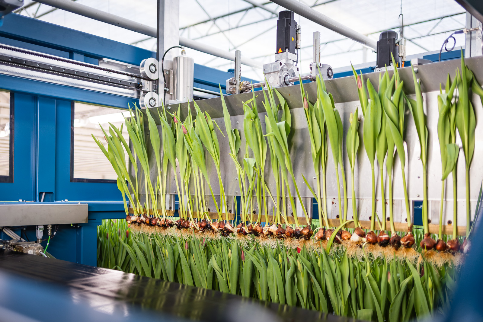 Der BulbPacker entnimmt die Tulpen automatisch aus den Kisten und positioniert sie auf einem Förderband.