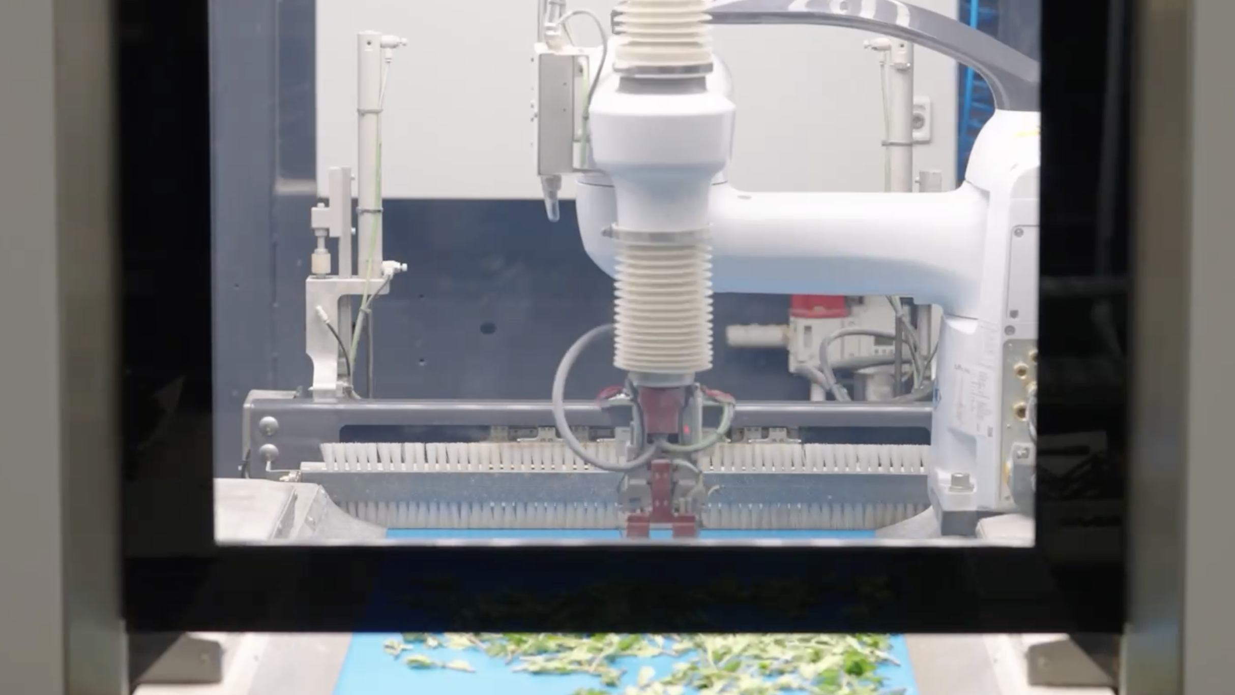 Die Bedienung des Cutting Planter 4000 ist sehr einfach. Der Bediener legt das Schnittgut ungeordnet auf das Band. Das Band schüttelt dann das Schnittgut auf, so dass die einzelnen Stecklinge lokalisiert werden können. Der Roboter nimmt dann die Stecklinge einzeln auf und legt sie in die renovierte Steckbrücke. Diese Einsteckbrücke sorgt dafür, dass jedes Teilstück in der richtigen Länge und gerade in die Einsteckbrücke gelangt. Diese Einsteckbrücke setzt dann die Stecklinge in das Medium ein.
