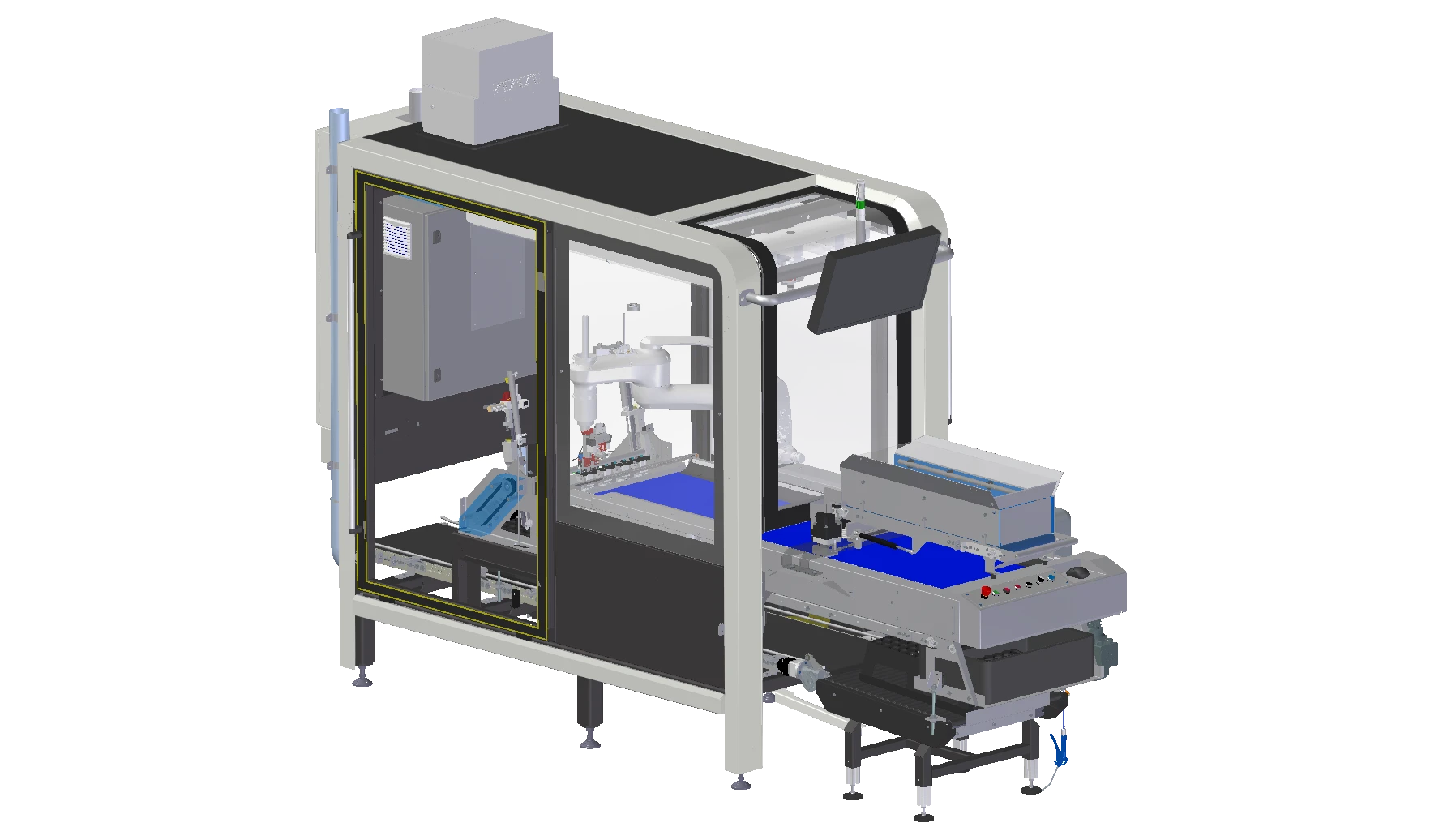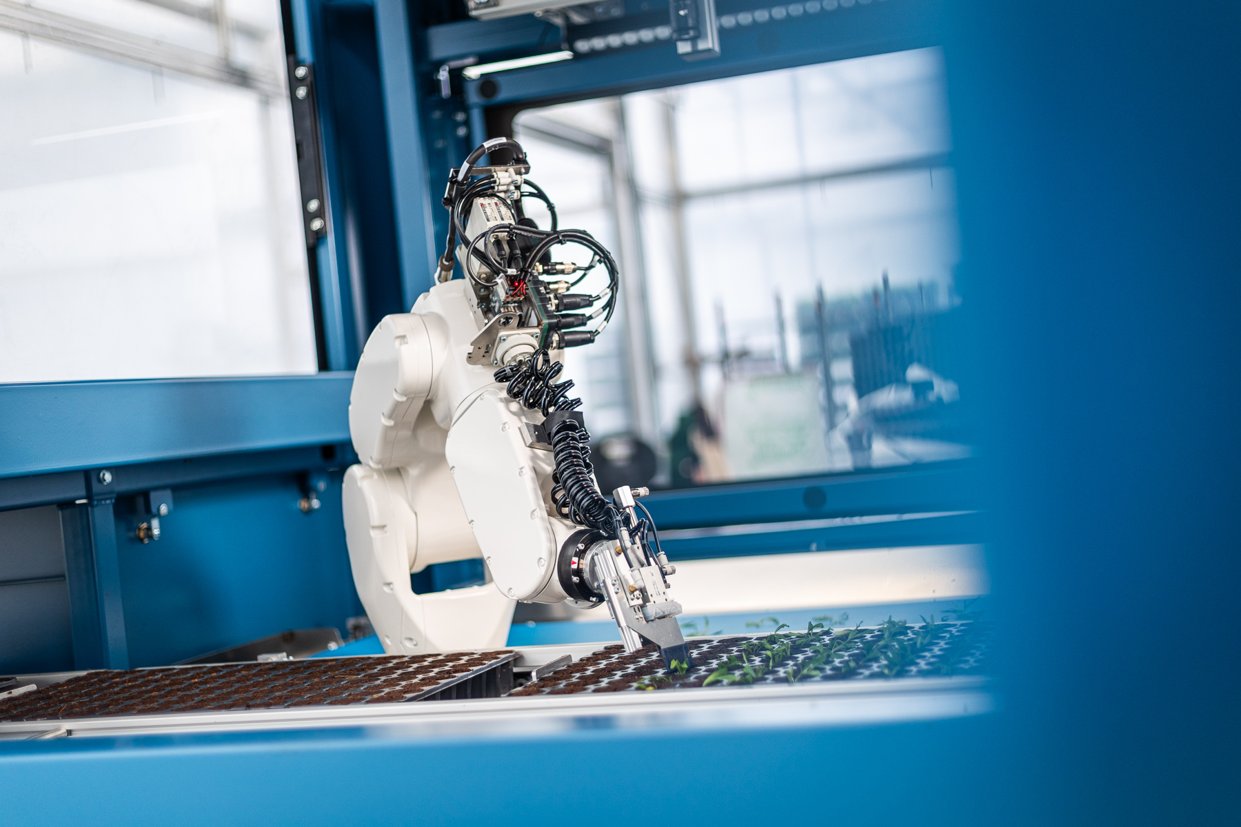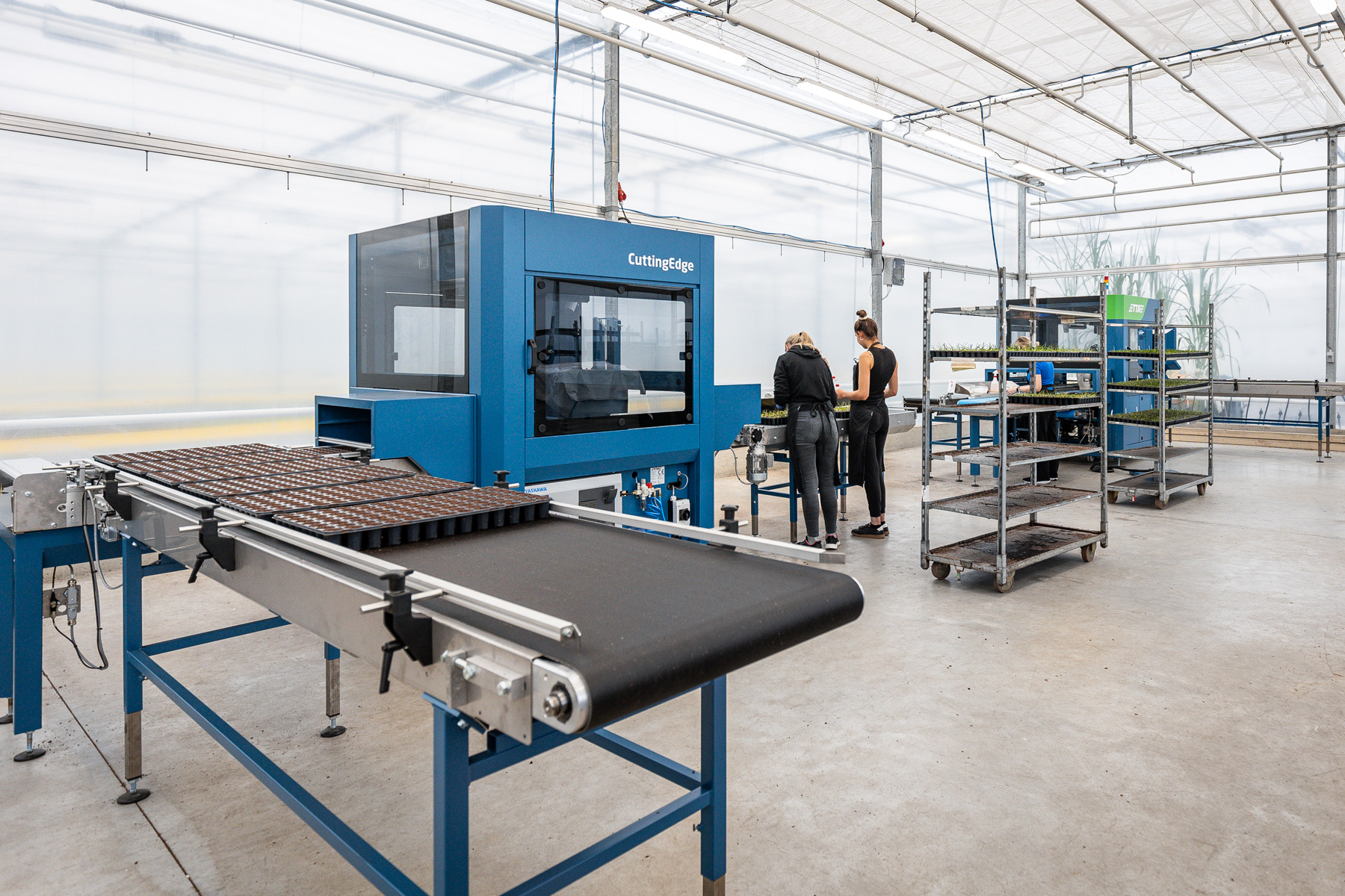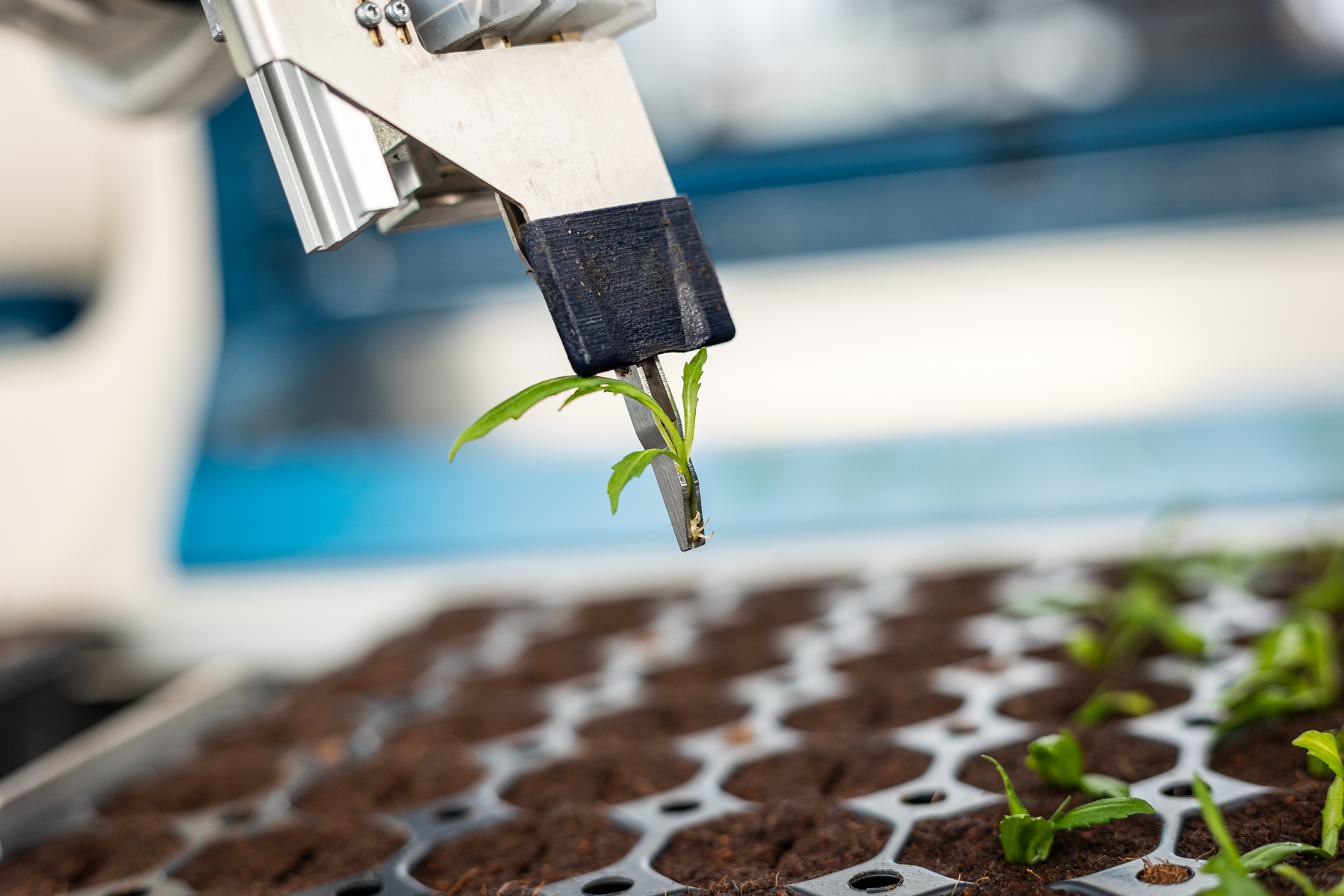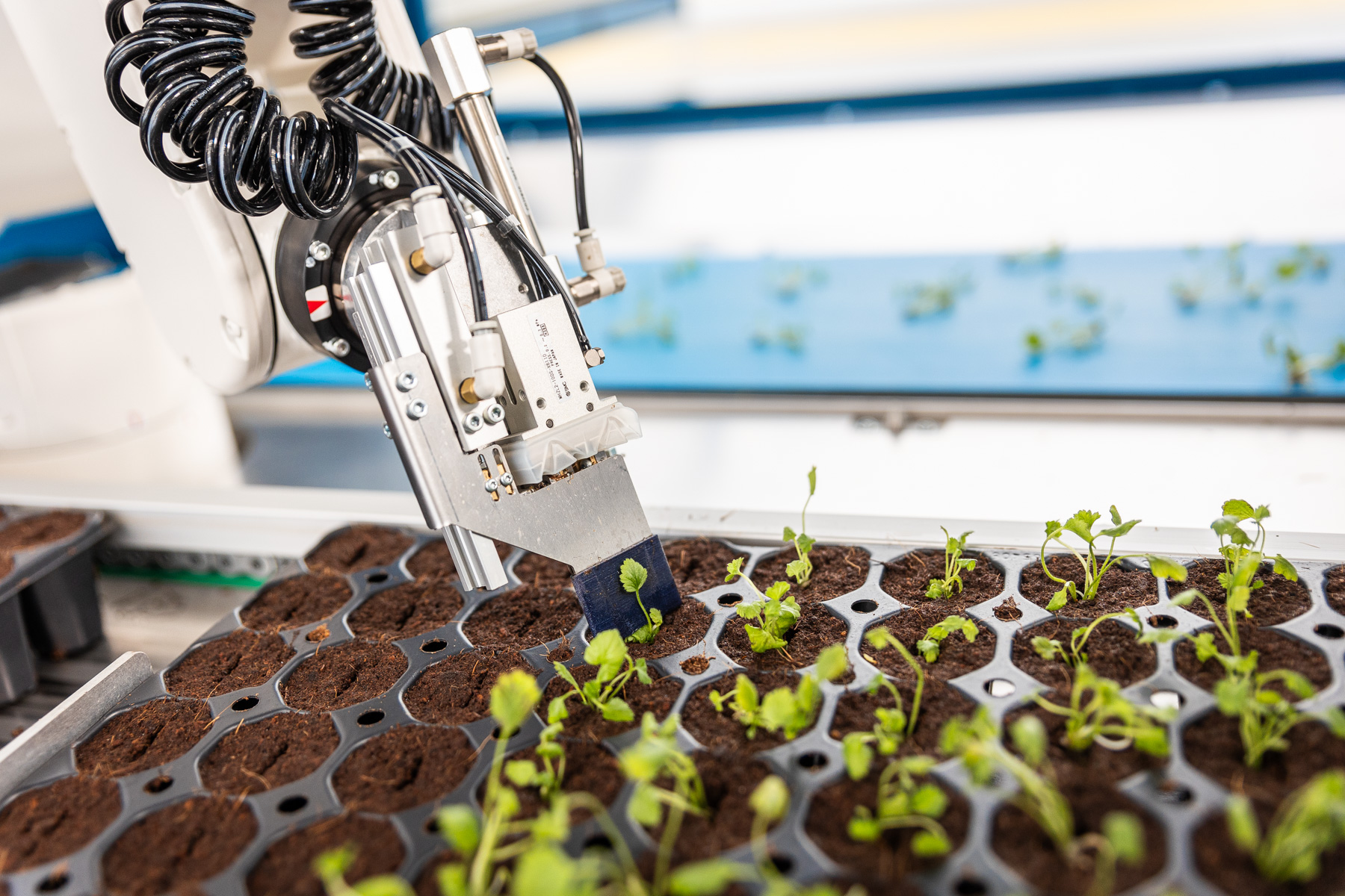 Das Kamerasystem bewertet die Stecklinge mit Hilfe des TTA-ISO CuttingVision-Systems. Nur qualifiziertes Schnittgut wird dann mit dem Roboterarm in die Steckschale gepflanzt. Abgelehntes oder doppeltes Schnittgut wird über ein Rückführsystem an den Bedienerplatz zurückgeführt.