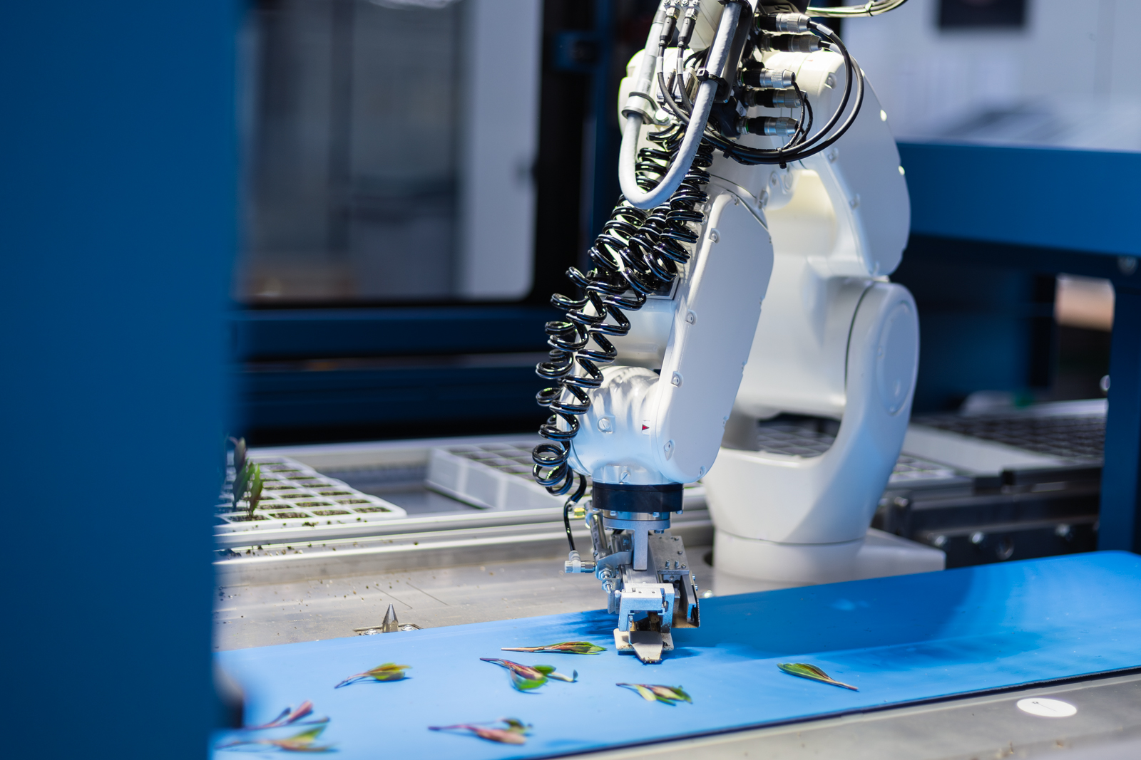 Das Kamerasystem bewertet die Stecklinge mit Hilfe des TTA-ISO CuttingVision-Systems. Nur qualifiziertes Schnittgut wird dann mit dem Roboterarm in die Steckschale gelegt. Ein Rückführsystem bringt abgelehnte oder doppelte Stecklinge zum Bedienerplatz zurück.