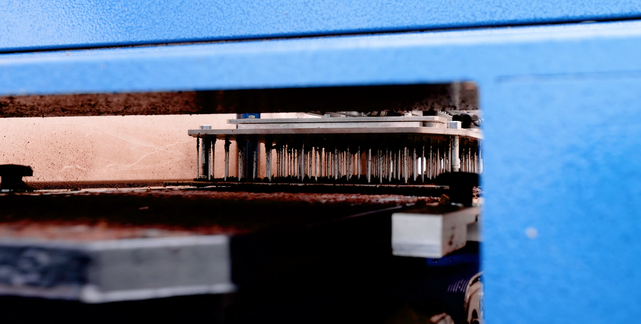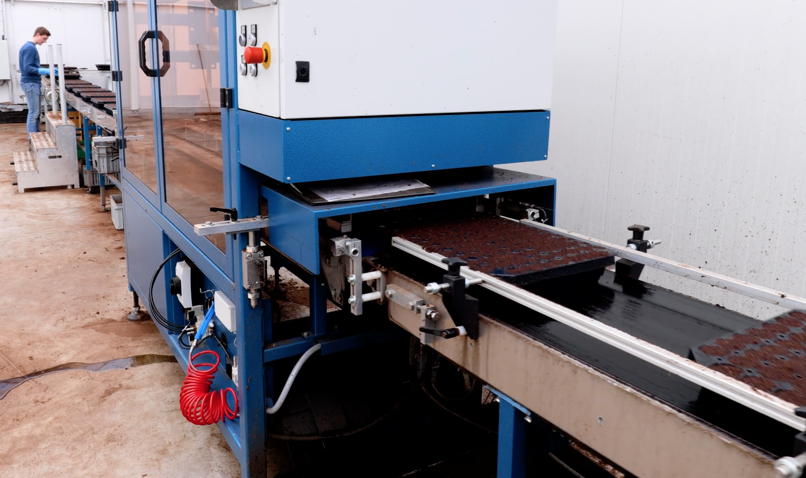 Ein Dibbelgerät, bei dem der Torf in der Aufnahmeschale nach unten gedrückt wird.