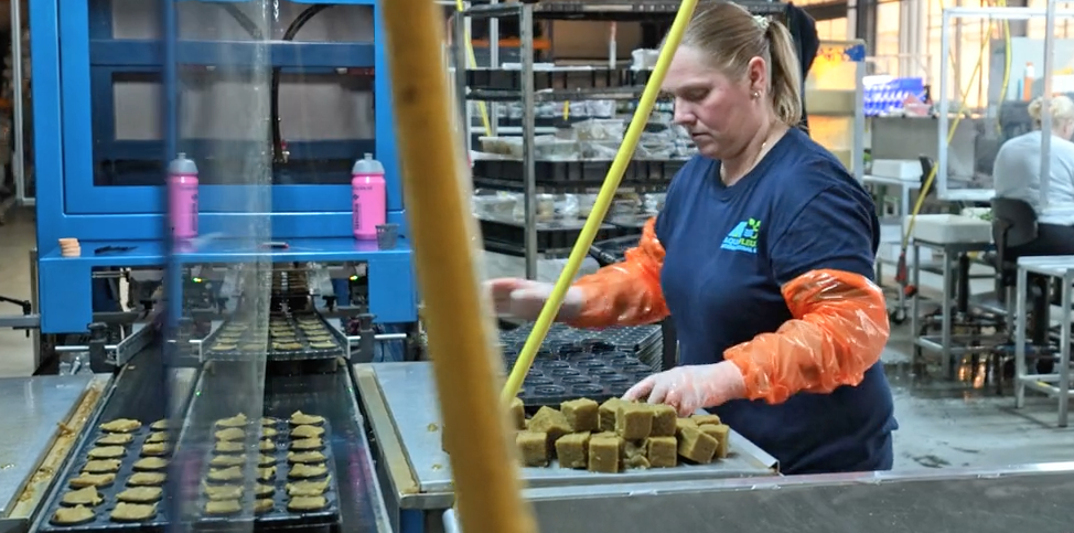 Die manual sticking line ist mit zwei Ebenen ausgestattet. Auf der oberen Ebene, wo die trays in die Klebelinie einlaufen, wird jedes einzelne Tablett separat vor den Mitarbeitern positioniert. Auf der unteren Ebene befindet sich ein Förderband mit Arbeitstischen, die auf beiden Seiten angebracht sind. Diese Arbeitstische sind kippbar, so dass die Mitarbeiter ihre ideale Arbeitsposition finden können. Die Mitarbeiter nehmen nun die trays von der oberen Ebene. Die Schwerkraft hilft ihnen, das Tablett auf ihren Arbeitstisch zu stellen.