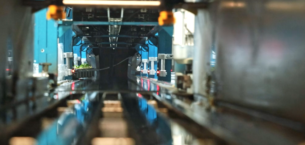 Ein doppeltes Fördersystem mit Anschlagpositionen für einzelne trays und entsprechenden Arbeitspositionen.